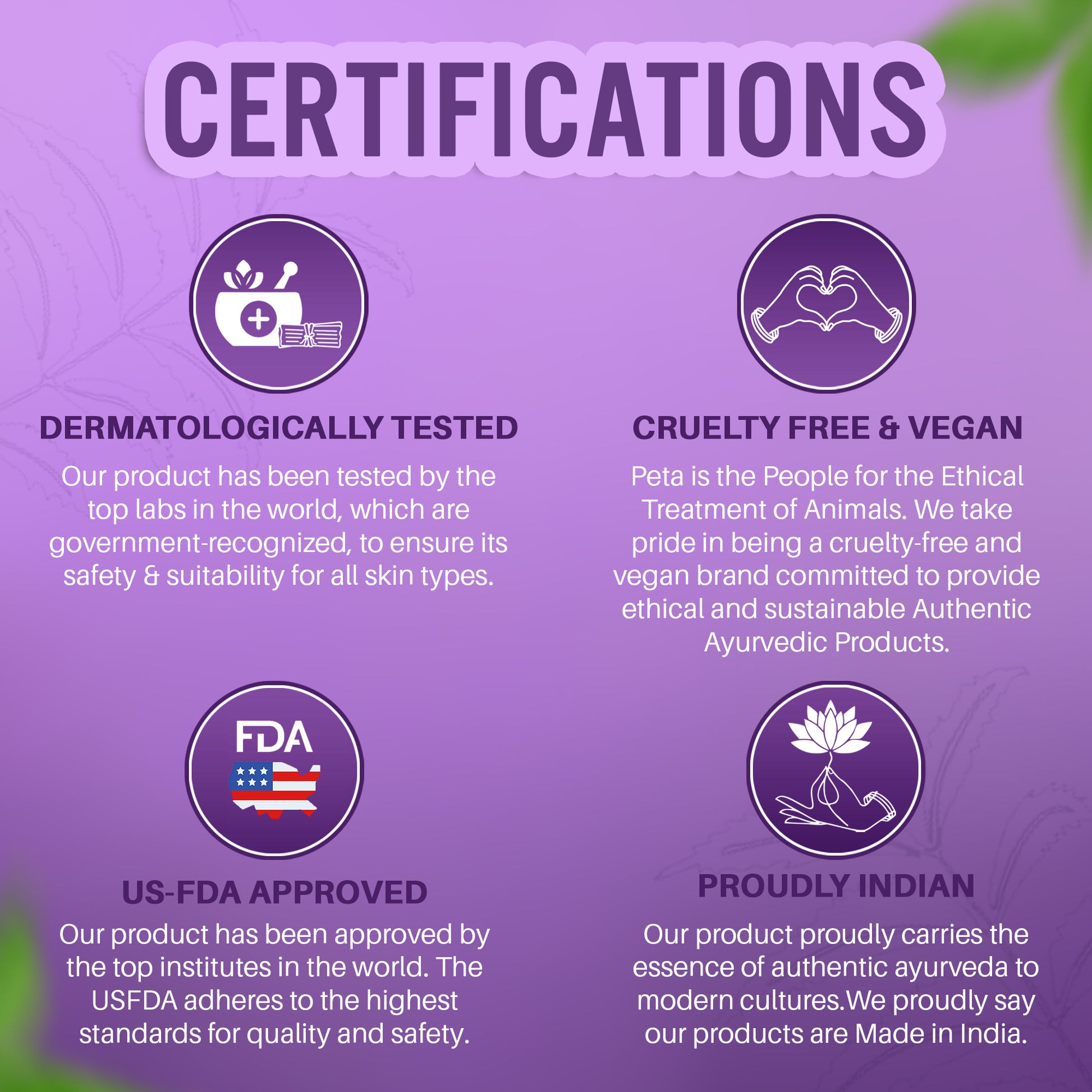 Neem (Azadirachta indica) 6 ml., Elva (Aloe barbadensis) 5ml., Papaya (Carica papaya ) 5ml., Ashoka (Saraca asoca) 4ml., Tulsi (Ocimum sanctum) Haridra (Curcuma longa ) 3ml., Chandan (Santalum album) 3ml., Gandhbiroja (Pinus roxburgii) 2ml., Base q.s. to make 100%.