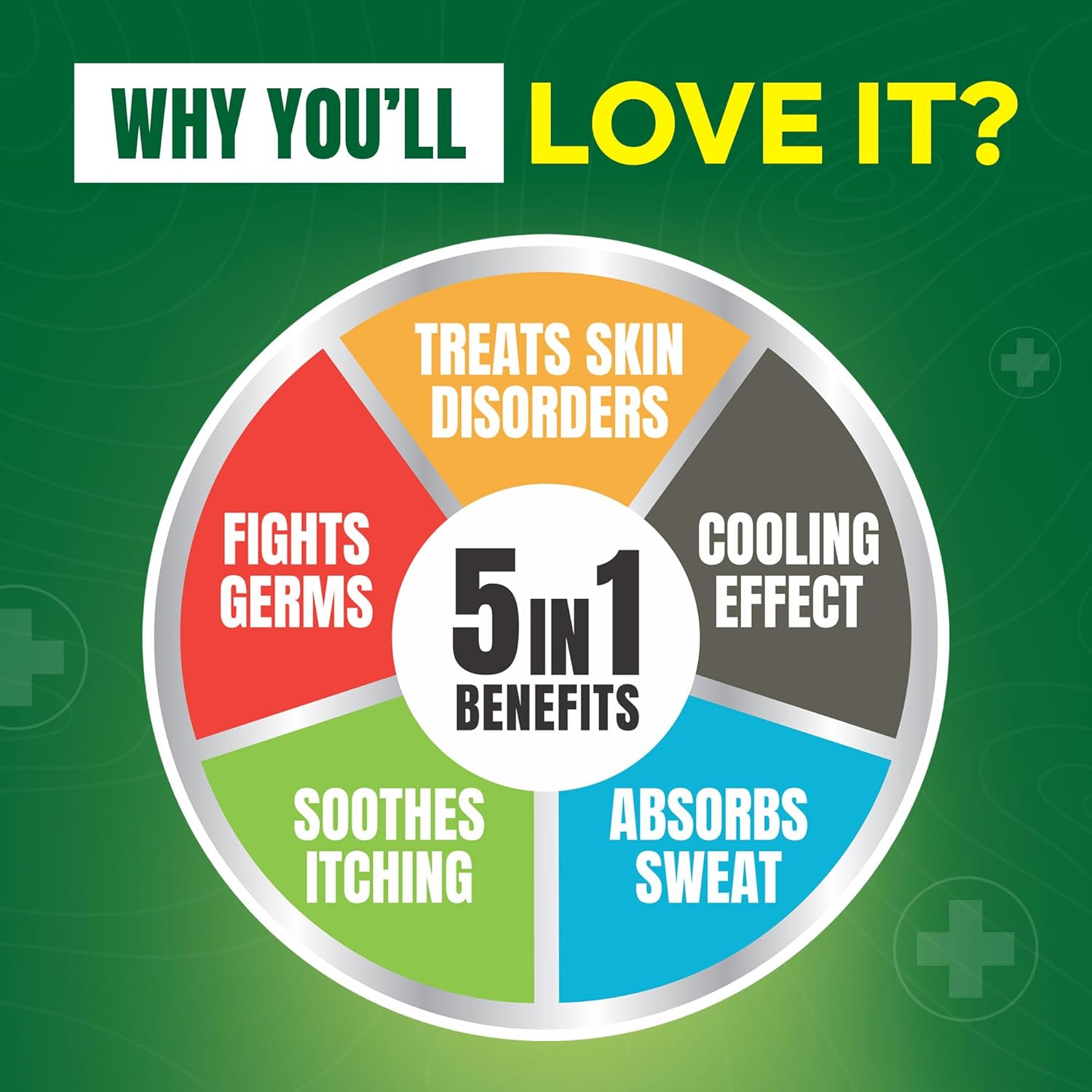 It helps treat and prevent minor skin disorders by keeping skin dry and free from excess moisture. It also soothes itching, redness, and irritation caused by sweat or humidity.