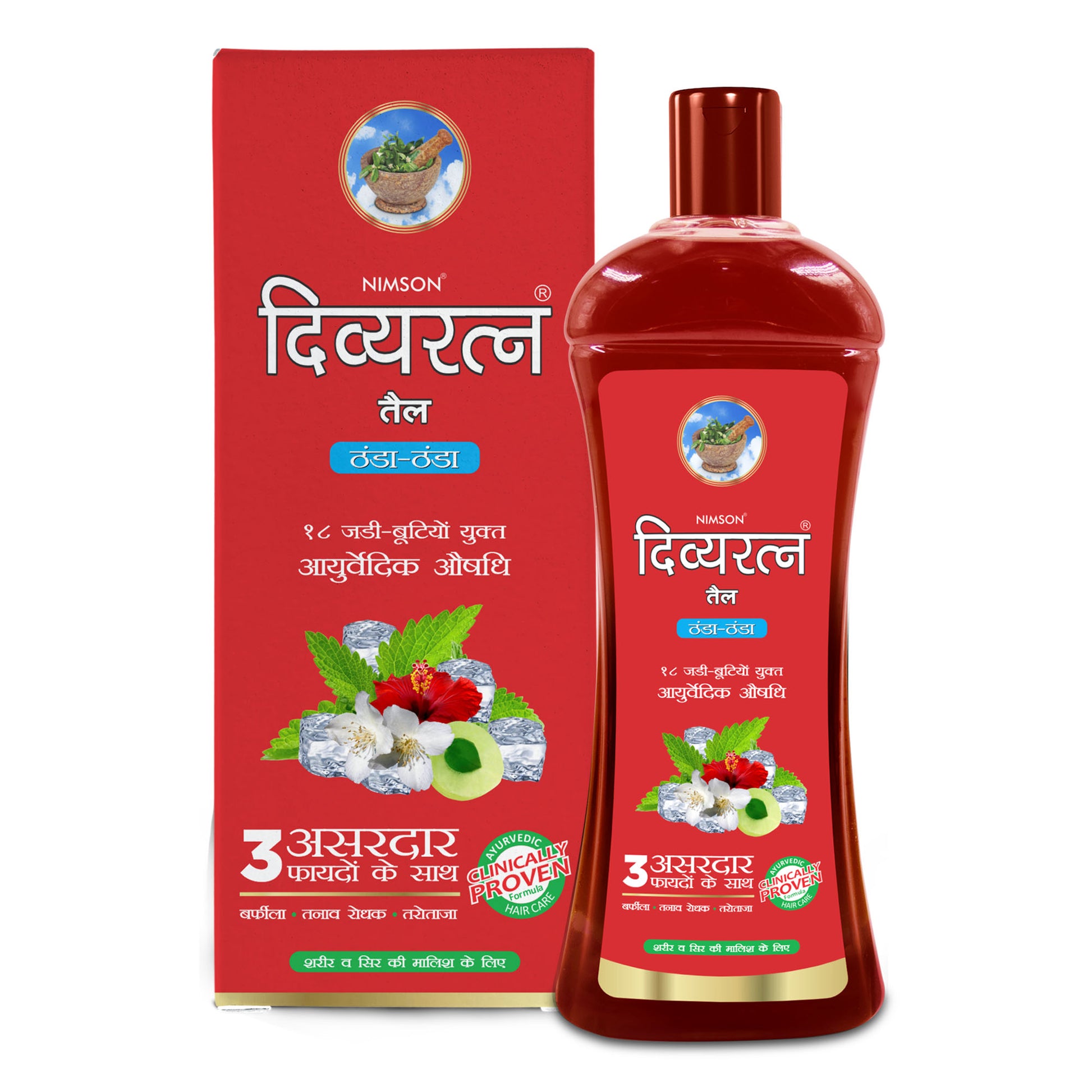 Nimson Divyaratan Oil is a unique blend of natural ingredients that provides fast relief from headaches, stress, and body pain, while also nourishing your scalp and hair. This oil cools, relaxes, and rejuvenates your body and mind after a long day.
