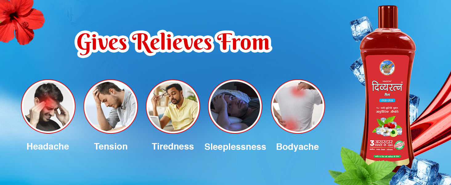 Nimson Divyaratan Oil is a unique blend of natural ingredients that provides fast relief from headaches, stress, and body pain, while also nourishing your scalp and hair. This oil cools, relaxes, and rejuvenates your body and mind after a long day.