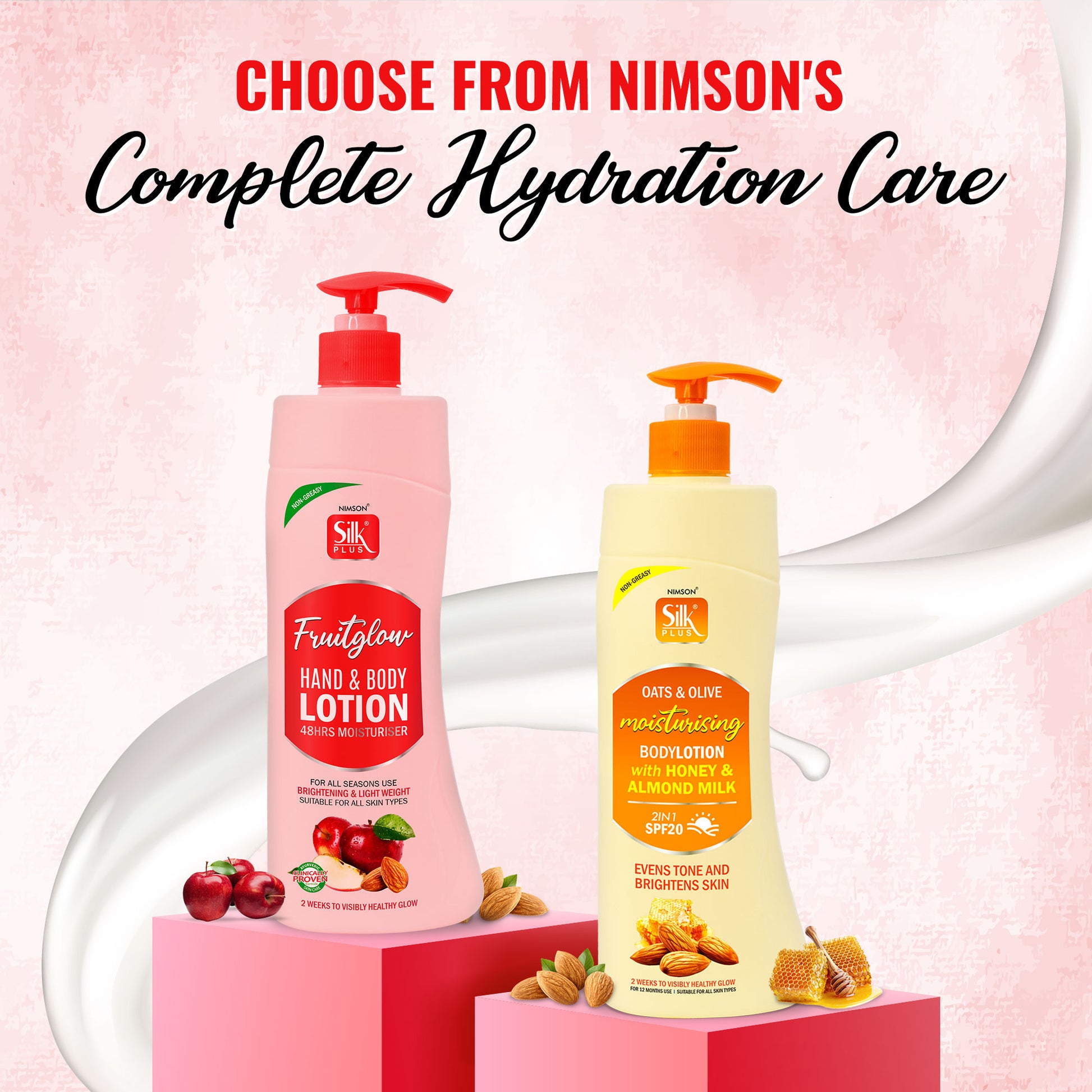 Nimson Fruit Glow Body Lotion offers 48-hour moisture, leaving skin soft, smooth, and radiant. Lightweight and dermatologist-tested, it locks in hydration with natural fruit extracts for a refreshed, glowing complexion.