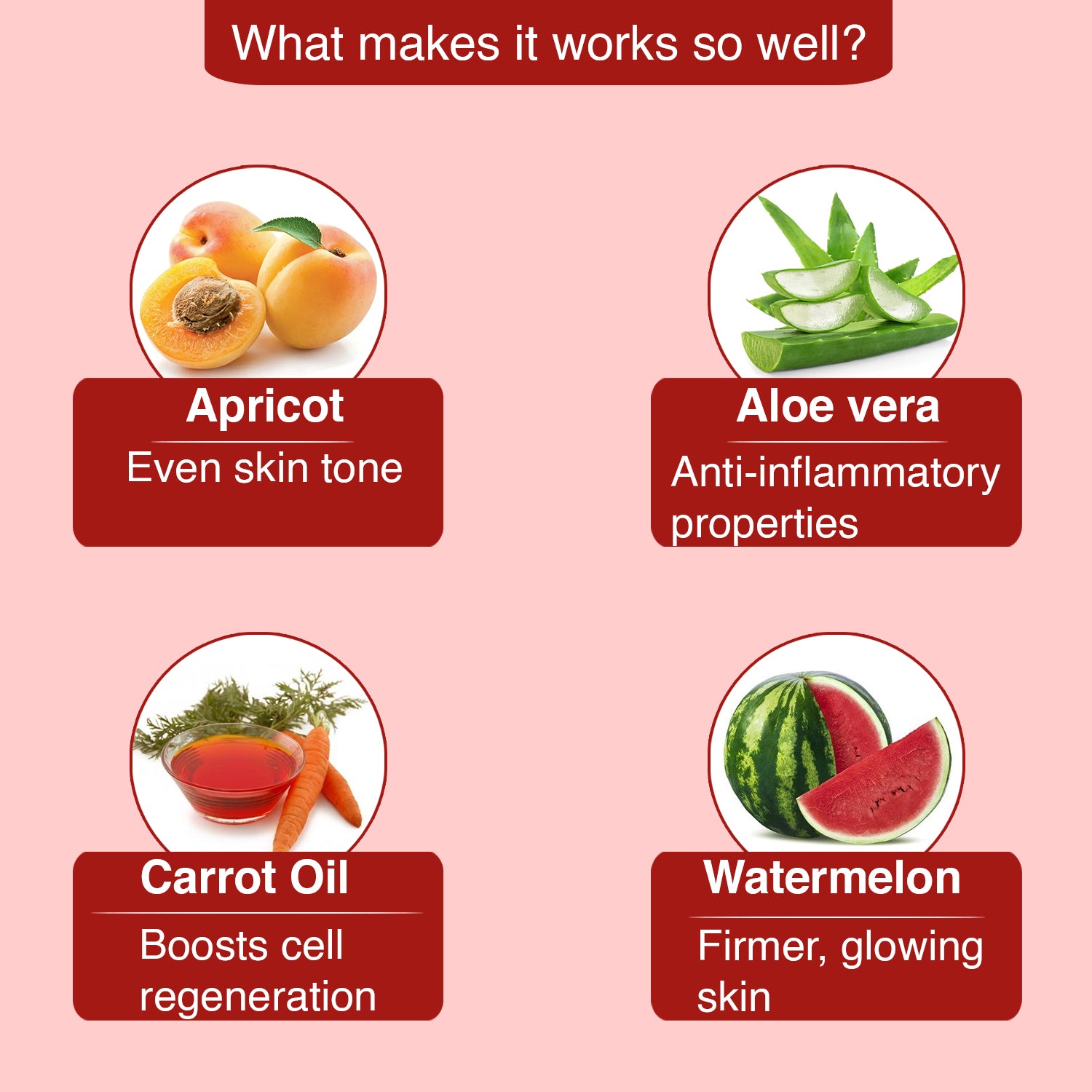 Fruit Glow Moisturizing Cream combines the nourishing power of apricot & aloe vera extract to give your skin the hydration and radiance it deserves. This rich yet lightweight cream deeply moisturizes your skin, improving its complexion and providing a healthy, glowing appearance. Suitable for all skin types, it works to hydrate dry patches, even out your skin tone, and leave your skin feeling soft, smooth skin.