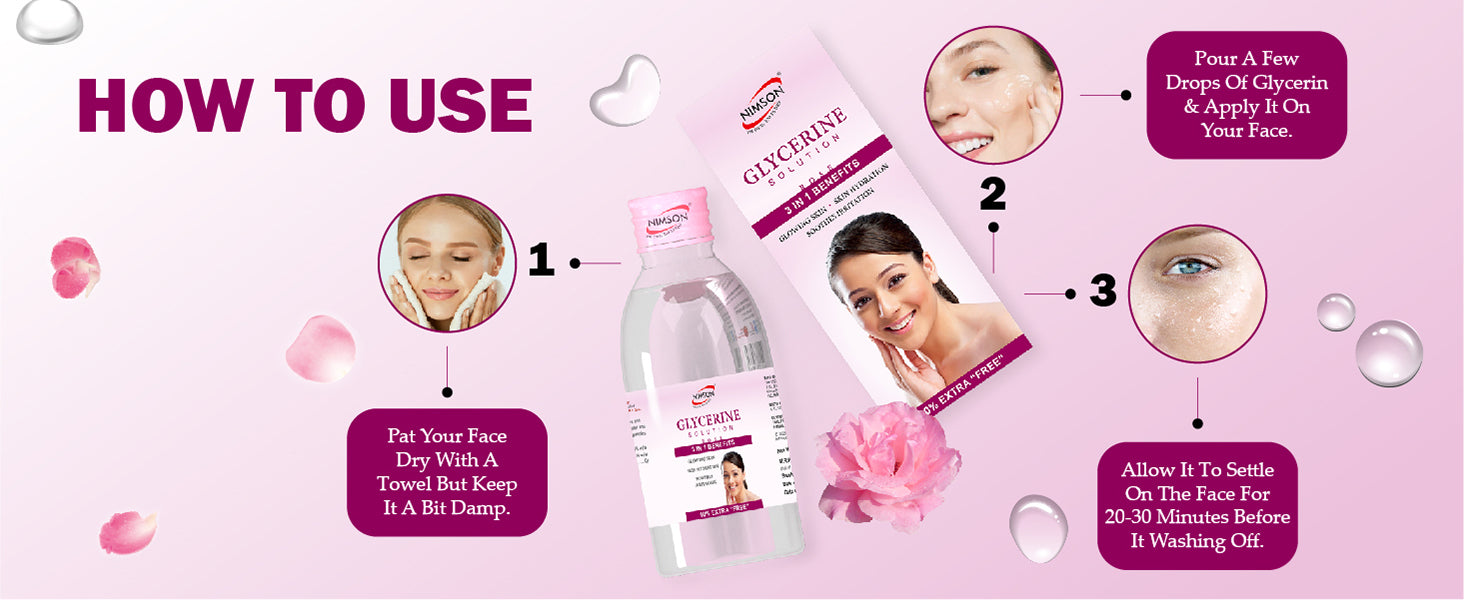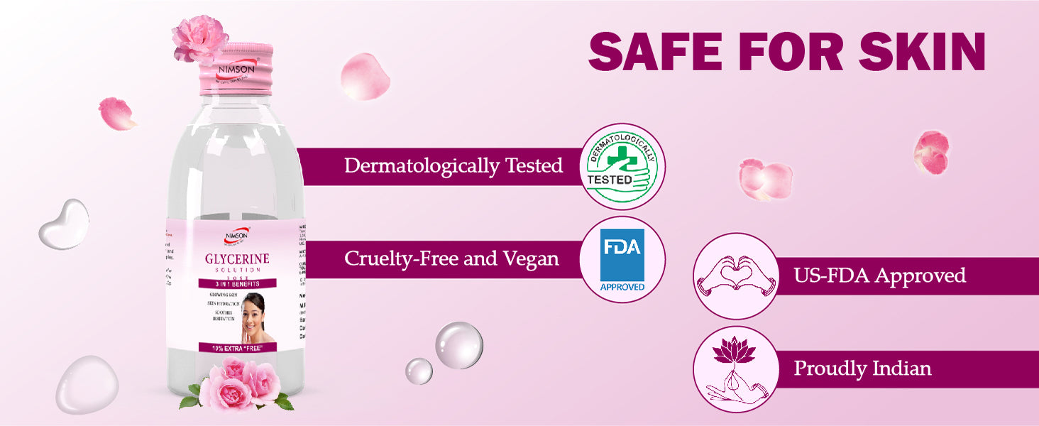 Nimson Glycerine Solution provides 48-hour hydration, leaving skin soft, smooth, and radiant. Lightweight and dermatologist-tested, it locks in moisture for a refreshed, glowing complexion.