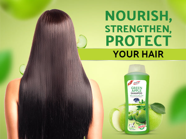Nimson Green Apple Shampoo deeply cleanses the scalp, controls excess oil, and restores shine. Leaves hair feeling light, fresh, and naturally bouncy.