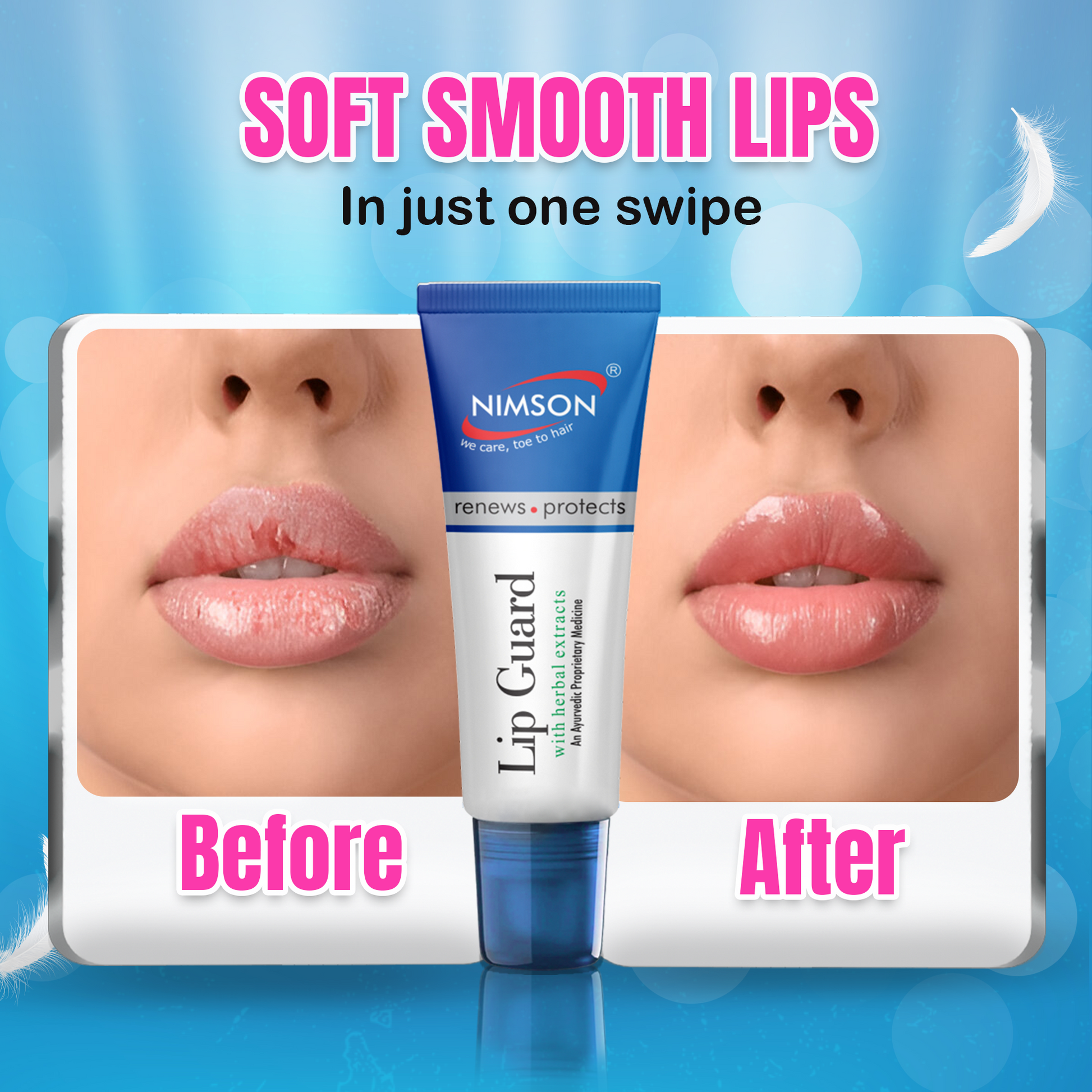 Nimson Lip Guard deeply nourishes and protects lips, keeping them soft, smooth, and hydrated. Its lightweight formula locks in moisture, preventing dryness and chapping for healthy, supple lips.