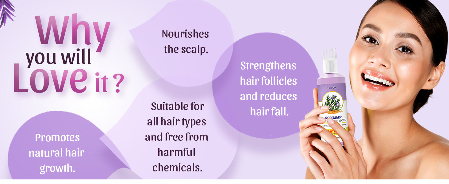 Rosemary oil improves circulation to the scalp, stimulating hair follicles, while other oils and herbal extracts nourish and strengthen the hair from root to tip.