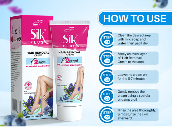 Nimson Silk Plus Tulip & Blueberry Hair Removal Cream gently removes hair, with action starting in 2 minutes. It calms and nourishes sensitive skin with Tulip and Blueberry extracts, leaving it smooth and irritation-free