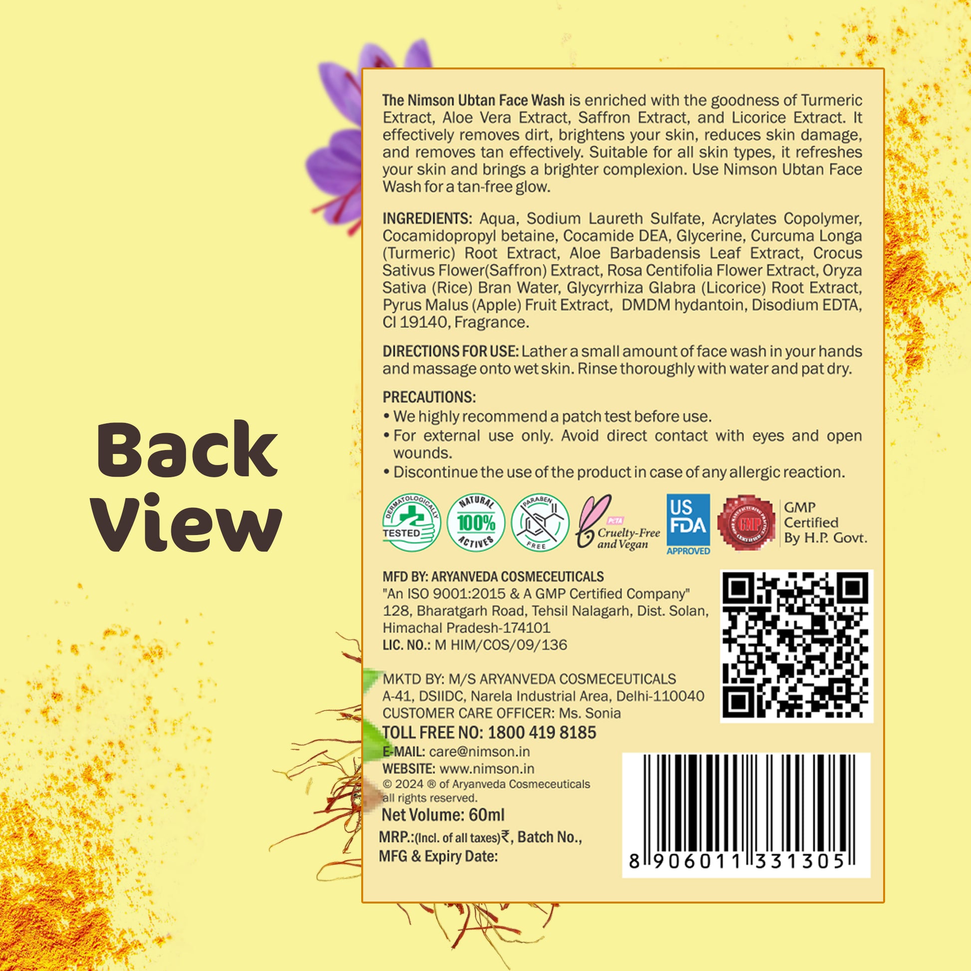 Unveil a radiant, smoother, and more even-toned complexion with the natural goodness of Nimson Ubtan Face Wash. Enriched with pure ingredients like turmeric and saffron, this powerful yet gentle formula works to deeply cleanse and revitalize your skin, effectively removing tan and restoring its natural glow.