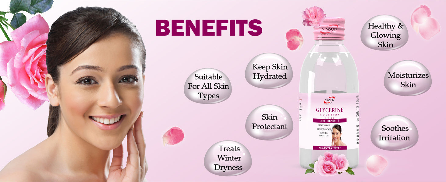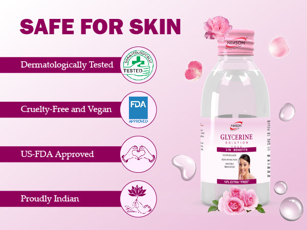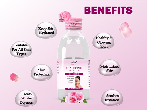 Nimson Glycerine Solution provides 48-hour hydration, leaving skin soft, smooth, and radiant. Lightweight and dermatologist-tested, it locks in moisture for a refreshed, glowing complexion.